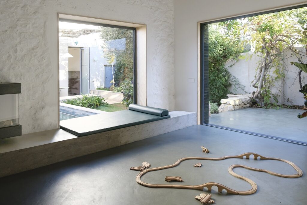Outro aspeto marcante do design da Casa Jericho é o seu compromisso com a sustentabilidade. A escolha de materiais e a orientação dos espaços foram cuidadosamente pensadas para maximizar a eficiência energética. As soluções sustentáveis incluem o uso de materiais reciclados e estratégias passivas de aquecimento, que não só reduzem a pegada ecológica da casa, mas também criam um ambiente mais saudável e confortável para os seus habitantes.